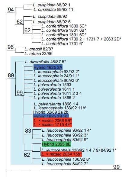 Despite the high frequency of hybridization and polyploidy in plants, significant challenges remain to disentangle reticulation from divergence in plant phylogenies. Recent collaborative research on Leucaena in Oxford and New Mexico has focused on understanding hybrid and polyploid origins using molecular data and a multi-locus gene tree approach. Studies of reticulation demand multiple, densely sampled, highly resolved and robustly supported biparentally inherited gene trees. Much of the work on Leucaena has been devoted to tackling problems posed by lack of informative variation in conventional DNA sequence loci and the occurrence of nrDNA pseudogenes (Hughes et al., 2002; Bailey et al., 2003, 2004) - issues that hinder reconstruction of robust, well-resolved species-level phylogenies for plants. This has involved one of the first studies to thoroughly explore the impacts of nrDNA polymorphism and non-functional pseudogene sequences on phylogeny reconstruction in plants (Hughes et al., 2002; Bailey et al, 2003) and development of a powerful method for identifying pseudogene sequences using phylogenetic trees and bootstrap hypothesis testing (Bailey et al., 2003). We showed that pseudogene sequences are common in nrDNA datasets, which dominate plant species-level phylogenetics, and that their detection is critical for accurate phylogeny reconstruction. To get around the problem of lack of phylogenetic resolution, we developed a novel SCAR-based technique to identify more rapidly-evolving, biparentally-inherited, nuclear DNA sequence loci that can generate gene trees with the required resolution and support (Bailey et al., 2004). Using one of these loci a number of putative hybrids have been investigated (Hughes et al., 2007). Comprehensive sequence data sets for a larger set of SCAR-based nuclear DNA sequence loci are currently under construction by Govindarajulu Rajanikanth, PhD student working with Donovan Bailey. More...